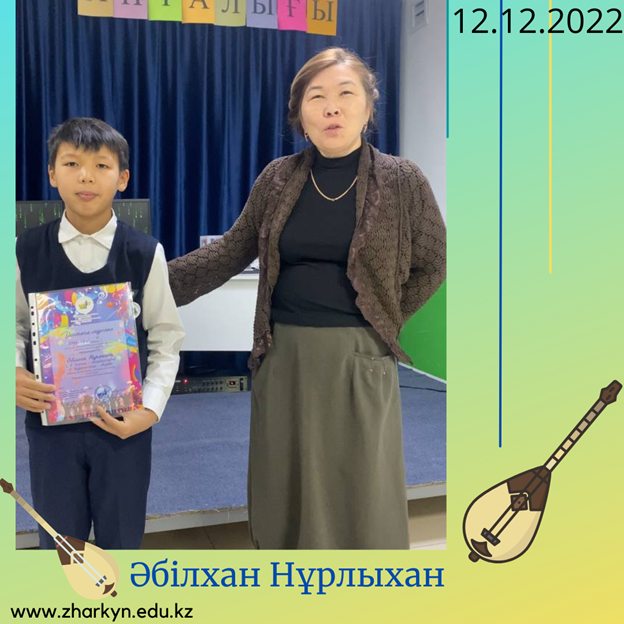 Құрметті оқырман, 6-сынып оқушысы Әбілхан Нұрлыхан өнер көрсету байқауында домбыра аспабында ойнап "ГРАН-ПРИ" жүлделі орын иегері атанды, екі күй орындалды: "Кербез сұлу" және "Адай" күйлері.